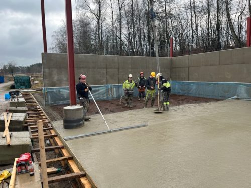 Idag gjuter vi plattan till vårt nya skärmtak vid lagret i Sjöbo. Ytan blir totalt 550 m², och i projektet ingår även en skärmvägg som delar av området till vår egen deponistation.